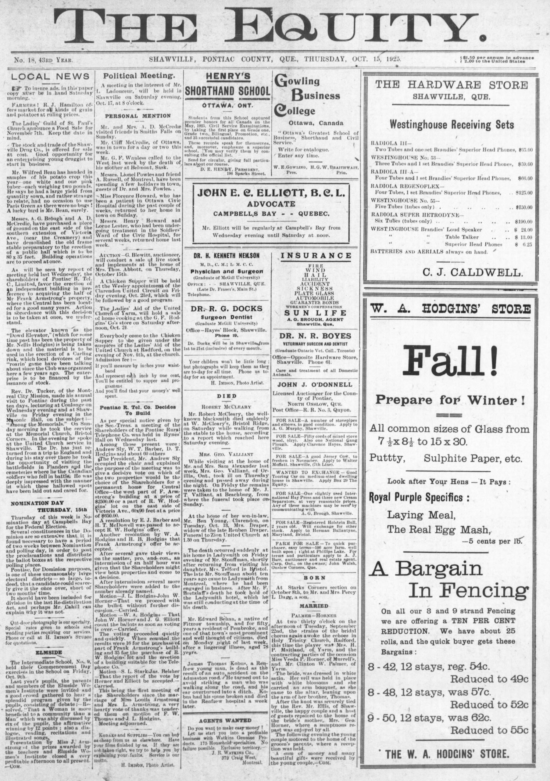 Local news: Messrs. E. Hodgins & Son have recently made a change in the post office equipment, whereby the delivery