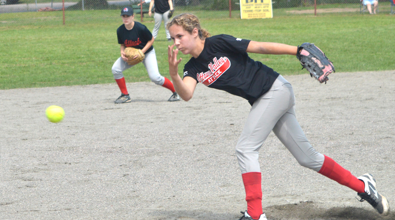 The weekend is centred around a three-pitch tournament, with other games mingled throughout, as well as some late-night homerun derbies and a dizzy bat challenge. Pictured, Olivia McLaughlin pitches a fast one during the junior exhibition game on Saturday.
