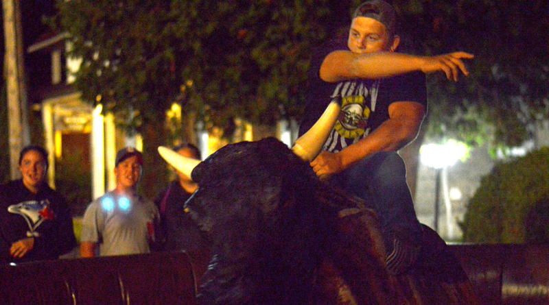 Saturday night featured more baseball, two DJ’s, a dizzy bat challenge, a home-run derby, a mechanical bull and more. Pictured, Marc Levigne holds on tight to the mechanical bull.