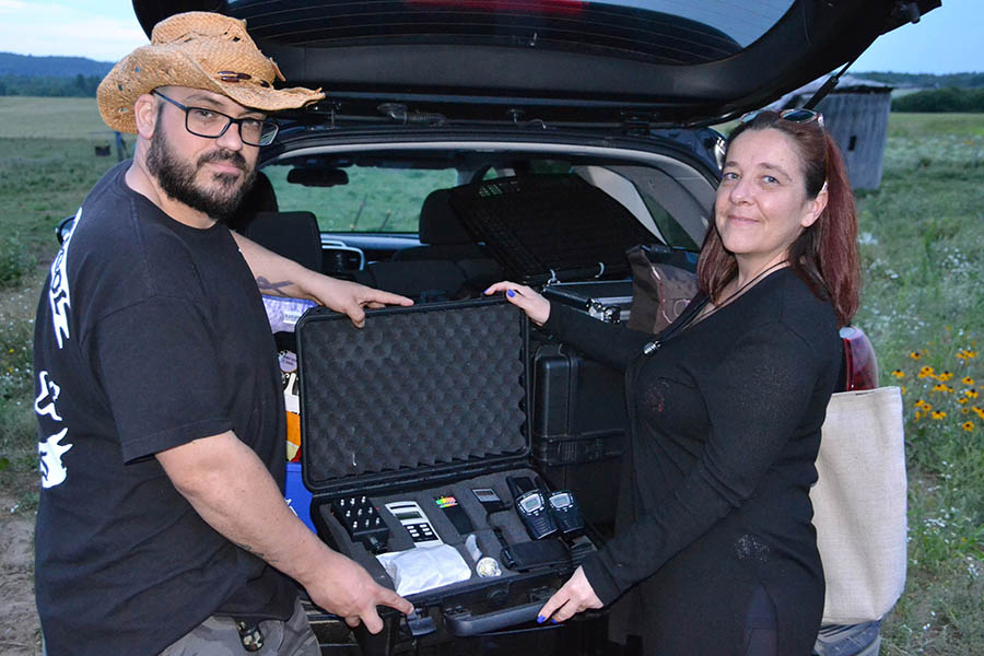 Patrick Labbe and Sandra Lepage show off an assortment of tools for detecting paranormal activity.