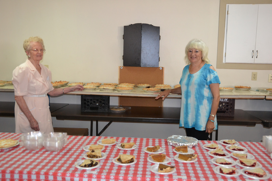 Joan Sicard and Barbara Pigeon pose with the plethora of pies at the dessert table on Sunday afternoon.
