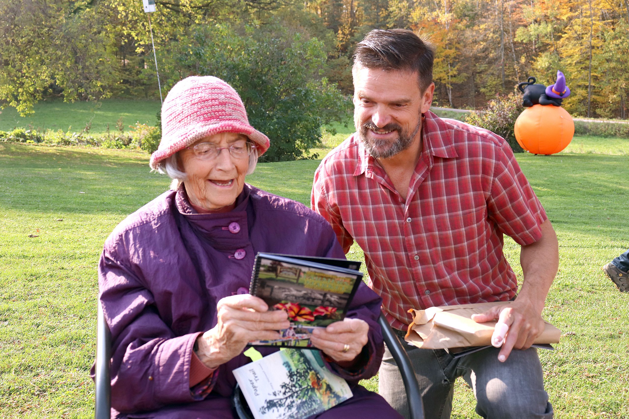 Mary McDowell Wood and Glen Hartle check out the cover of their newly released poetry book. Both of them contributed poems written for the book.