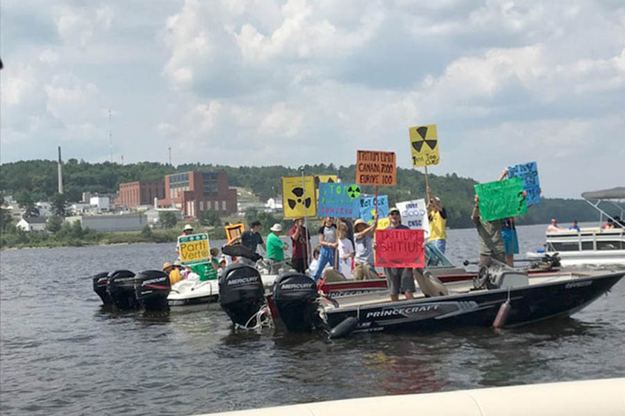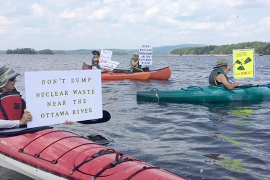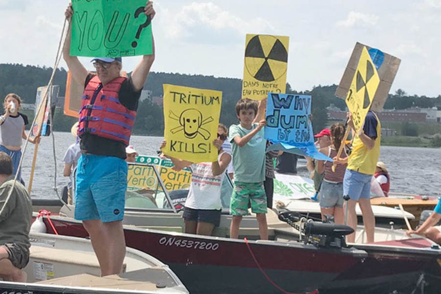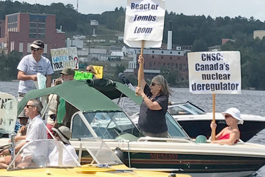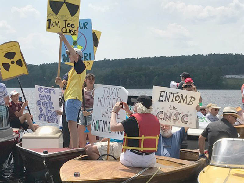 The protest was organized by the Old Fort Williams Cottagers Association (OFWCA) and the Concerned Citizens of Renfrew County and Area (CCRCA). More than 20 vessels carried dozens of protesters carrying signs and placards through the choppy waters towards the protest site 16 km upriver. The object of the group’s scorn was the proposed NSDF at Chalk River Laboratories, which will store low-level waste that has been radioactively contaminated at the site waste from other decommissioning work in Canada and radioactive waste from hospitals.