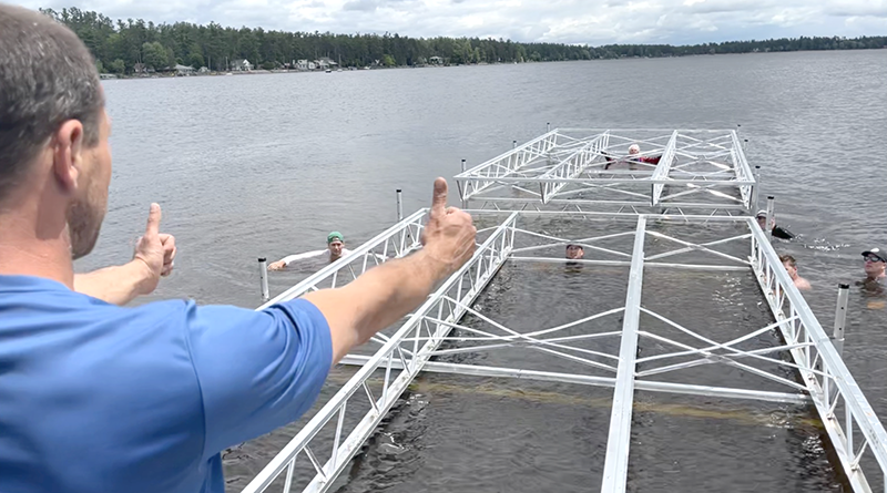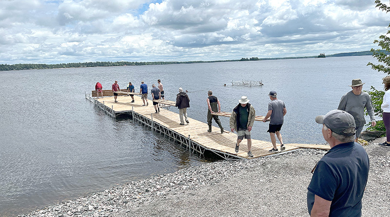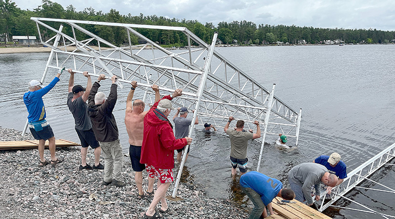 A crew of volunteers organized by the Norway Bay Municipal Association gathered at the community’s beach on Saturday to install new temporary docks, purchased by the municipality this spring.