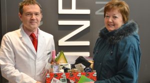 The suspense is over and a winner has been selected for the #ShopShawville raffle. The gift basket, featuring a plethora of goods from local merchants, was presented to Brenda Russell by Familiprix Pharmacy owner Marc Aufranc.