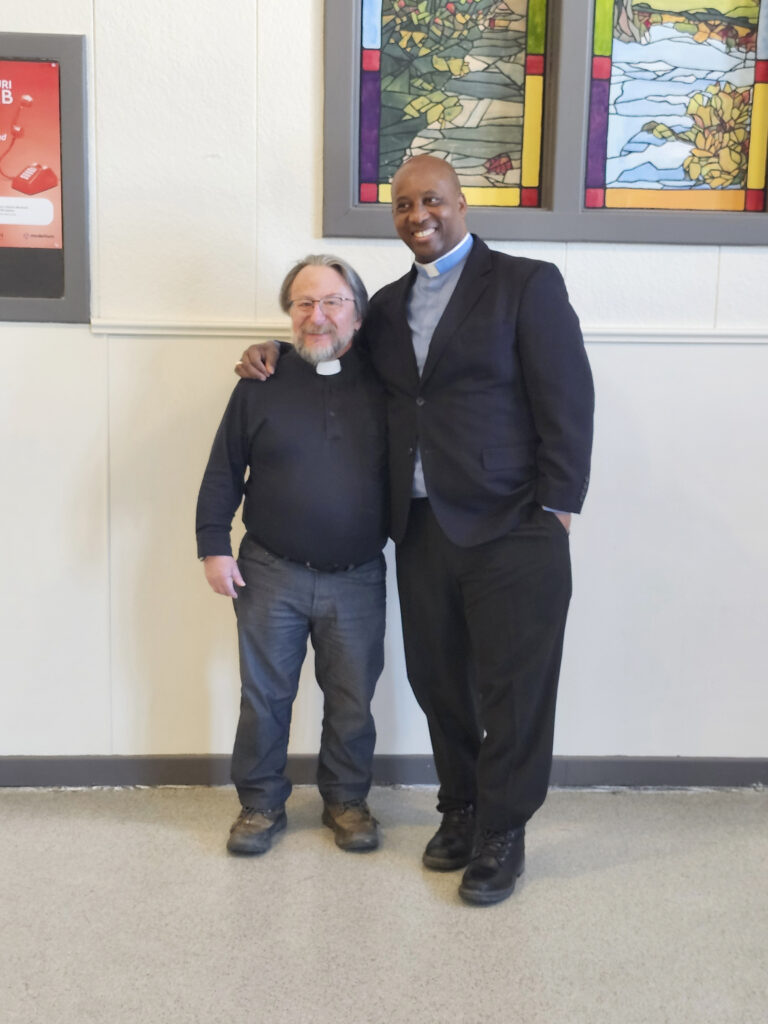 Outgoing Anglican minister Rev. Eric Morin (left) welcomes new minister Rev. Dr. Sony Jabouin.