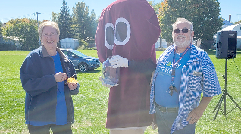Most walked, a few ran, the course which was marked with flags and went partially around the fairgrounds. Each lap ended by going through the Homecraft Hall, often met by a round of applause from volunteers. As participants emerged they were met by mascot “Mr. Renal”, who was holding a jar. When registering for the event, each participant was given a pouch of 15 kidney beans, so as they met “Mr. Renal” they would drop a bean into the jar. When their pouch was empty, they knew they had finished and done their part for research.