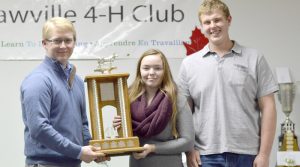 The Shawville 4-H Club held their annual awards banquet on Saturday night at the Jack Graham Community Centre, where nearly 40 prizes were distributed and the past year was reflected upon. From left: President Rebecca Nugent receives the Dalton Hodgins Dairy Judging award, presented by Dalton Egan.