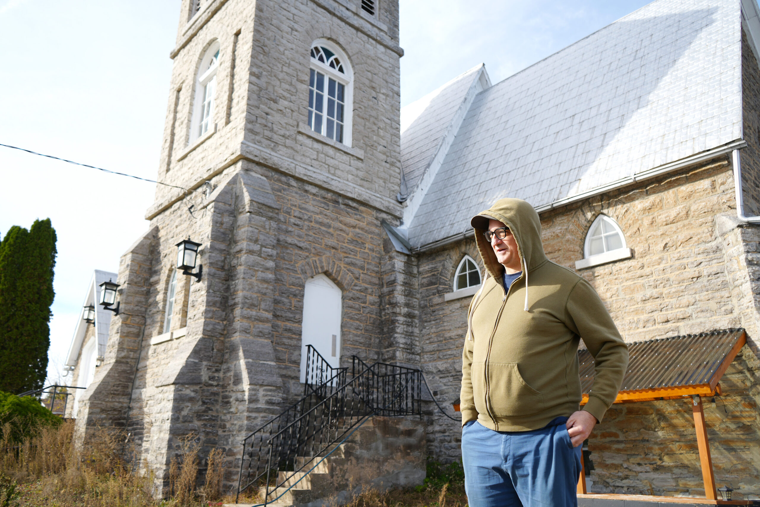 Dubue stands outside the St. John the Evangelist Anglican Church in Quyon, where he lives and where he hosted the first edition of Festival Fantôme last year. Photo: Sophie Kuijper Dickson