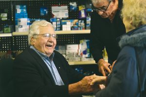 Dr. Roly Armitage, author of The Way it Was and Now and Now, About Yesterday, held a book signing in the Pontiac Printshop on Saturday morning, where old friends and new fans joined him for a chat and visit. Armitage welcomes Opal Carson to his book signing, while his son Mick Armitage, centre, makes the re-introductions.