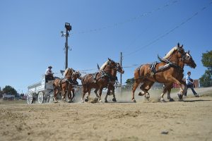 Later on, the stands filled to capacity and the cows were replaced with horses and wagons for the heavy horse show. The grand finale proved to be the six-horse hitch, for which the newly created Past Presidents trophy was awarded to the winners, Grier Family Percherons. Former President Ron Hodgins mounted the wagon and rolled out of the arena with the trophy held high to close out the competition.