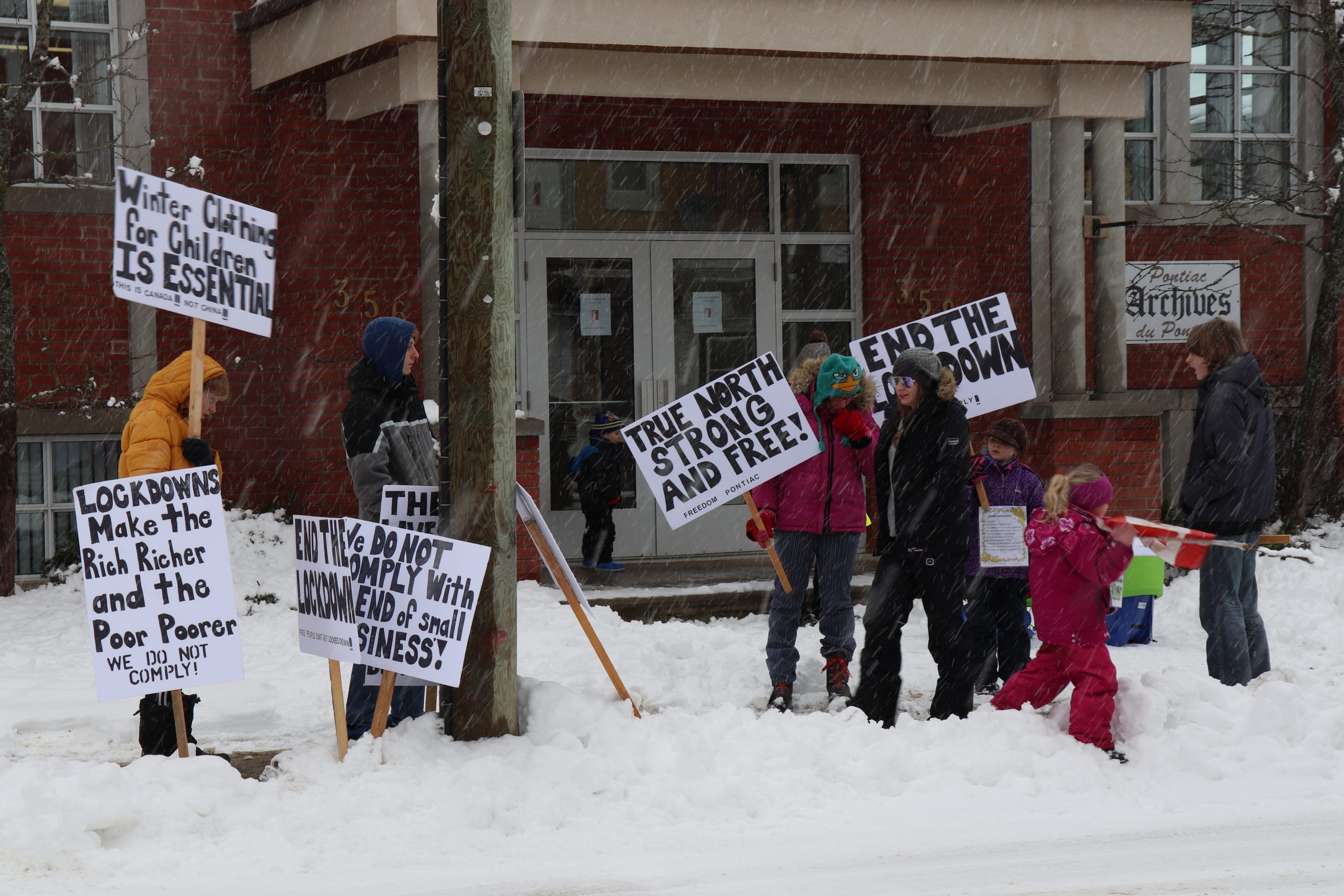 EMILY HSUEH SHAWVILLE Jan. 16, 2021 For the third weekend in a row, protestors took to the streets on Jan. 16, this time in Shawville, with handpainted signs to voice their disdain for the lockdown. Some of the signs were