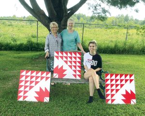 Recently, Kathleen Ranger, an artist from Campbell’s Bay, Que. and Martina Evans, a quilter and artist from Calumet Island, Que., together with Martina’s visiting 16-year-old granddaughter and Canterbury Art School student, Faith Evans from Orleans, Ont. decided to paint a two by two foot barn quilt square on wood, for mounting on a house, shed or building of their choice. To commemorate Canada’s 150th birthday they selected a red and white maple leaf quilt pattern.
