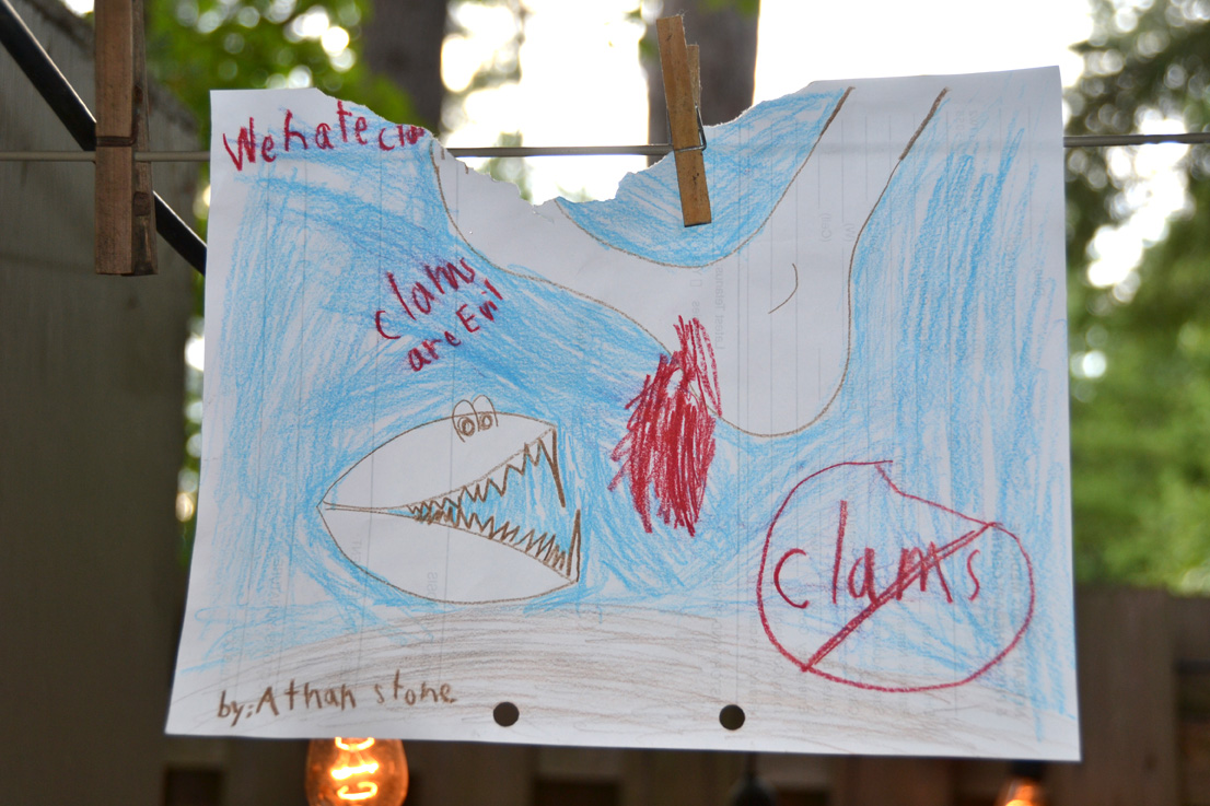 There was a wide variety of artwork on display at the Big Art Show in Norway Bay last Wednesday. Pictured left is Athan Stone’s magnum opus “We hate clams.”