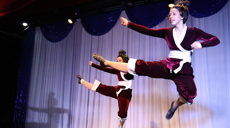 In mid-air doing a kick move, Olivia Draper performing Kung Fu Fighting with her peers wows the audience.