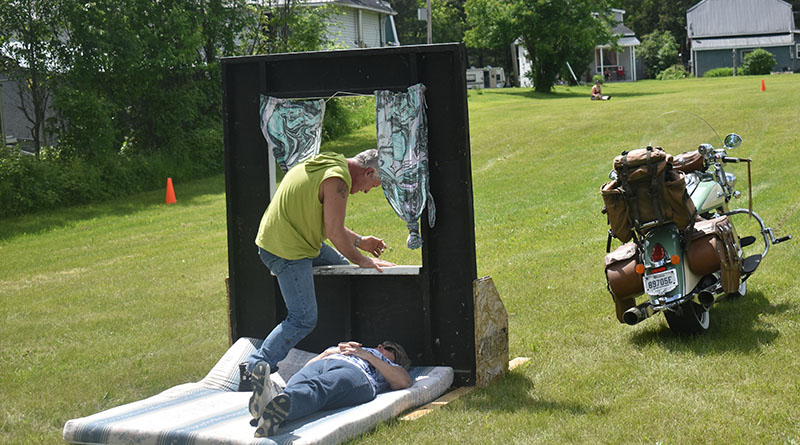 The rodeo saw five participants compete in various challenges with partners, such as trying to attach a clothespin to a clothesline on the back of a moving bike, trying to knock ping pong balls off pylons from the back of a moving bike while being sprayed by water guns, and a game called “honey I’m home,” where the biker would lay on mattress with one of the female rally spectators, and would have to get up, put his shoes on, escape through the window to his bike after the host yelled “honey I’m home.” The winner was the person who crossed the finish line with the fastest time.