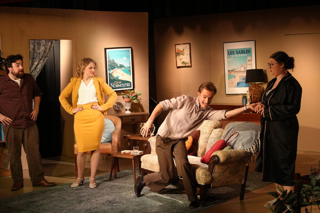 The play is an influential comedy written by French playwright Marc Camoletti. The plot centres on Bernard (played by Grant Moore) a man romantically involved with three different airline stewardesses, Gloria, Gabriella and Gretchen (played by Emma Findlay, Sarah Malatesta, and Sydney Côté respectively) without them knowing. Circumstances conspire so that all three are in town at the same time and hilarity ensues as Bernard, along his visiting friend Robert (Matt Lafleur) and his maid Berthe (Christine Rieux) try to contain the mayhem.