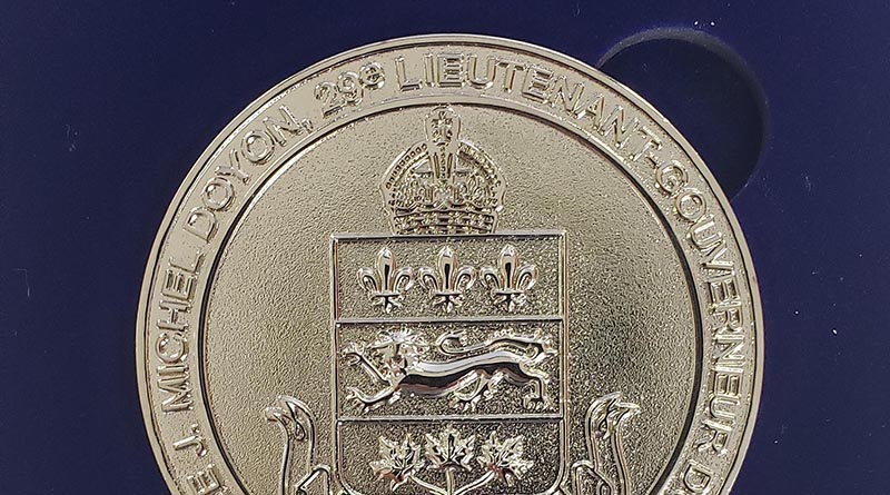 Each recipient was awarded a pair of medallions, one the size of a large coin, the other a smaller lapel pin, both inscribed with the name of the Honorable J. Michel Doyon, 29th Lieutenant Governor of Quebec, with accompanying certificates that said (translated from French) “We hereby award you the Lieutenant Governor’s Medal for Seniors and have it entered in our Register of Honors,” signed by Hon. Doyon.
