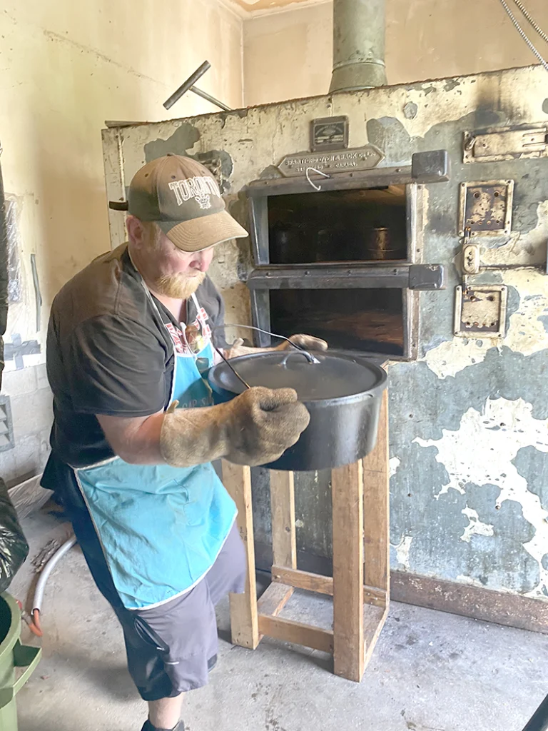On Saturday night he visited the oven every two hours to keep the fire going and add water to the pots.