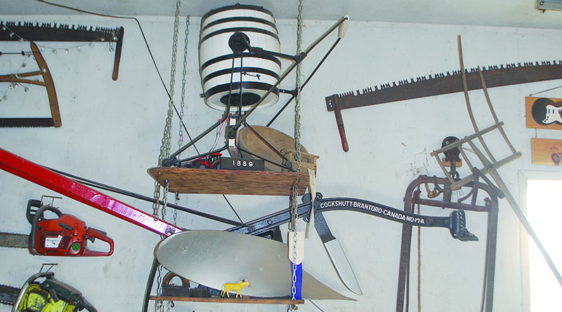 Among the 76-year-old’s collected artifacts are an old ice cream maker, a 1889 butter churn that he refurbished, cross-cut saws, old cart wheels and a hay bale hoist that he proudly displays in his garage.
