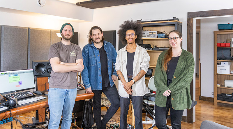 Four of the members of Transistor Media in their control room (left to right): François Larivière, Julien Morissette, Alexis Elina and Amélie Rondeau.