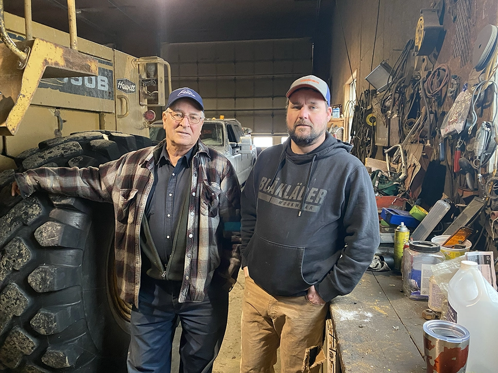 Maurice Morin (left) and grandson Steve Morin (right) stand in their garage on Front Street in Campbell’s Bay where, in the early morning of Feb. 4, Maurice had his pickup truck stolen. Photo: Sophie Kuijper Dickson