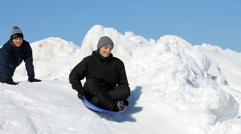 Close by, there was a mound of snow with staircases carved in its sides. A make-shift slide cascaded down from one side of the mound, accompanied by a couple of toboggans at the top.
