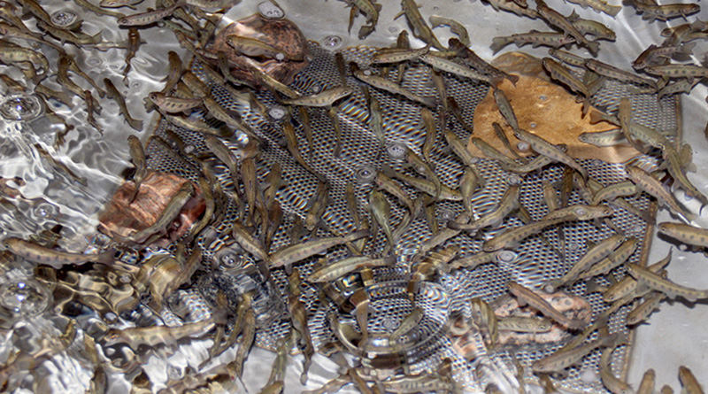Laura works full time raising both Speckled and Rainbow trout. The process begins with Laura buying eggs from another fish farm near Quebec City. These eggs are then transported on ice by plane to Ottawa where Laura picks them up. When they are back at Cedar Creek, Laura hatches the eggs in under-water jars. Each jar is capable of holding 60,000 eggs.