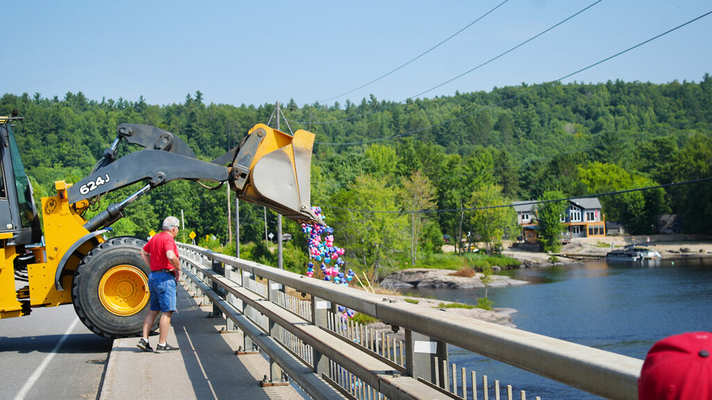 Saturday morning Merv Fleming, with the front end of a loader filled with 750 rubber ducks, temporarily stopped traffic on the Chapeau bridge to dump them into the river below for the Lions Club’s annual duck race fundraiser.
