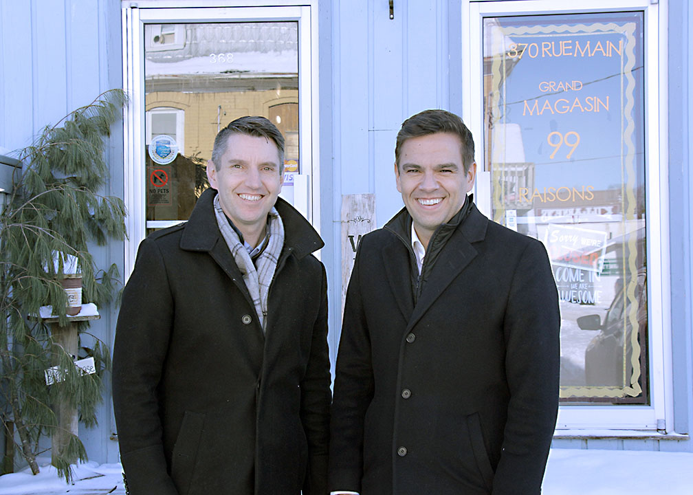 Pontiac MNA André Fortin (left) and Charles Milliard (right) stand outside Hursty’s Restaurant in Shawville during Milliard’s first bid for leadership of the Quebec Liberal Party in the winter of 2025. Photo: K.C. Jordan