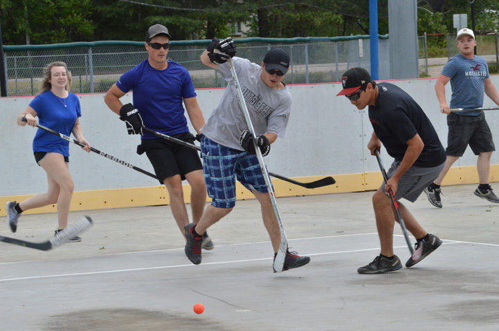 Fort Coulonge saw its first double sports tournament take over Amyotte Park on Saturday, as fundraising for the Pontiac Senior Comets kicked off when teams competed in games of ball hockey and softball. From left: Vicky Boisvert, Daniel Lance, Nathan White, Marc Fortin and Denis Dagenais chase the ball during the morning hockey games.