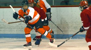 All the local teams played a game on home ice that day, and all minor Comets received free admission to the Pontiac Senior Comets game that night, if they wore their jersey. Pictured, Bantam player Oceane Boucher winds up to fire the puck to a teammate.