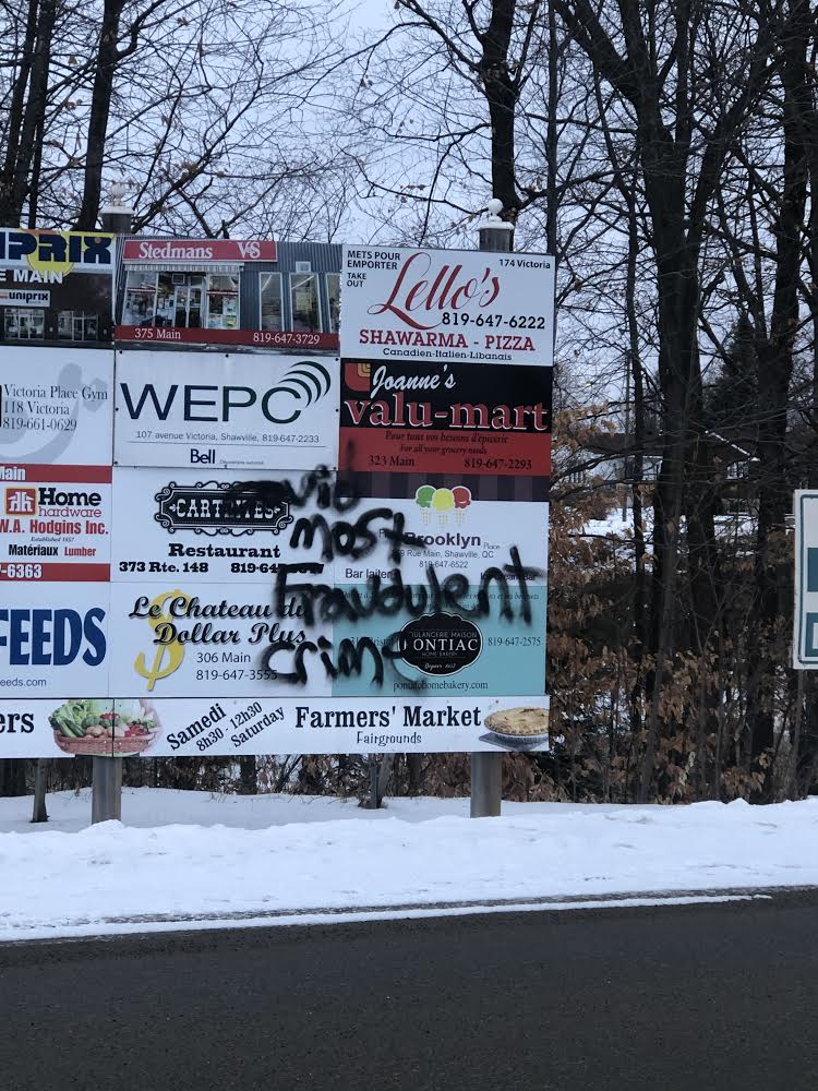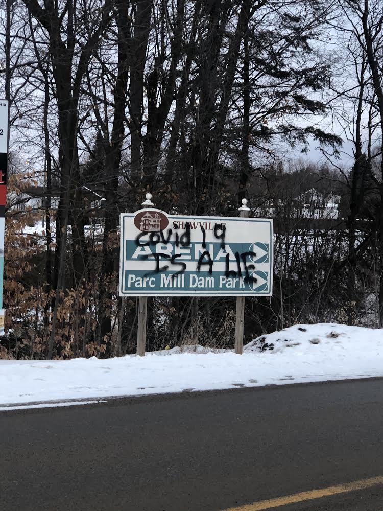 The Municipality of Shawville is offering a $100 reward to help identify a vandal who made their way around Shawville in the early hours on Jan. 12 and spray-painted COVID-related messages on several different surfaces, including Pontiac High School (PHS) and the Shawville business directory sign.