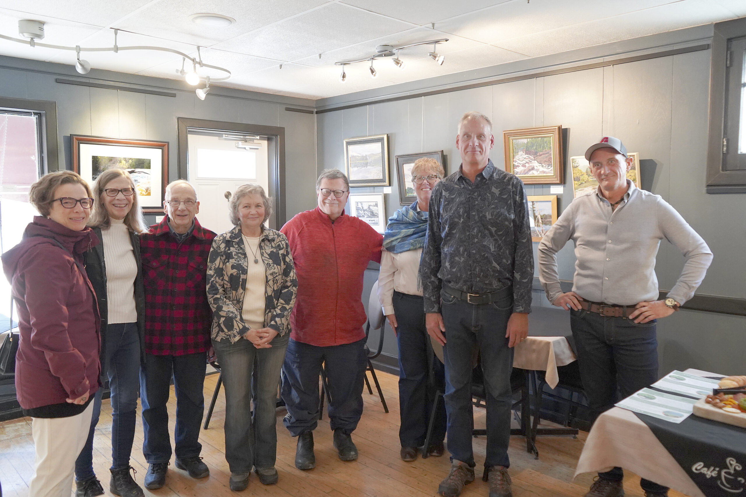 The Ottawa Valley chapter of the Canadian Parks and Wilderness Society (CPAWS) held a vernissage on Saturday afternoon at Café 349 in Shawville, showcasing works created during the Dumoine River artists retreat that they host in the summer. From left are Jennifer Haughton, Barb Haughton, Peter Haughton, Linda Roy, Andrew Craig, Penny Johnston, Lyndon Johnston and CPAWS-OV director John McDonnell.