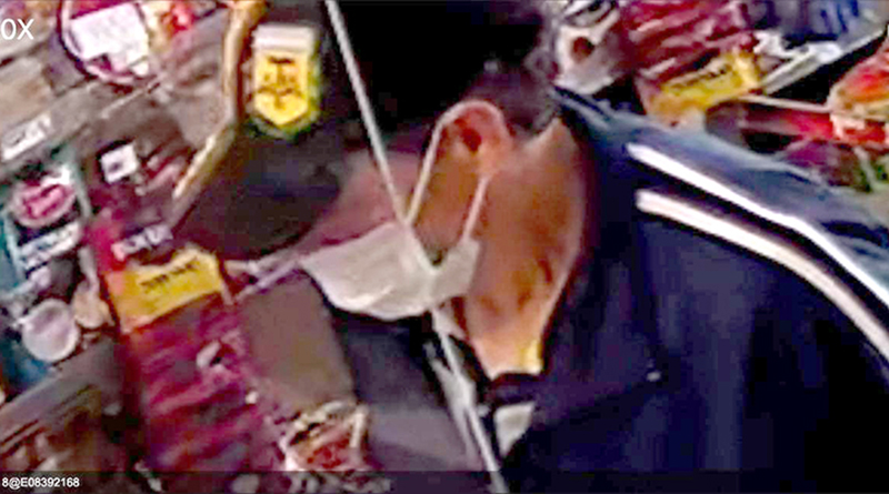 Security camera image shows a man in a ball cap and covid mask in the convenience store.