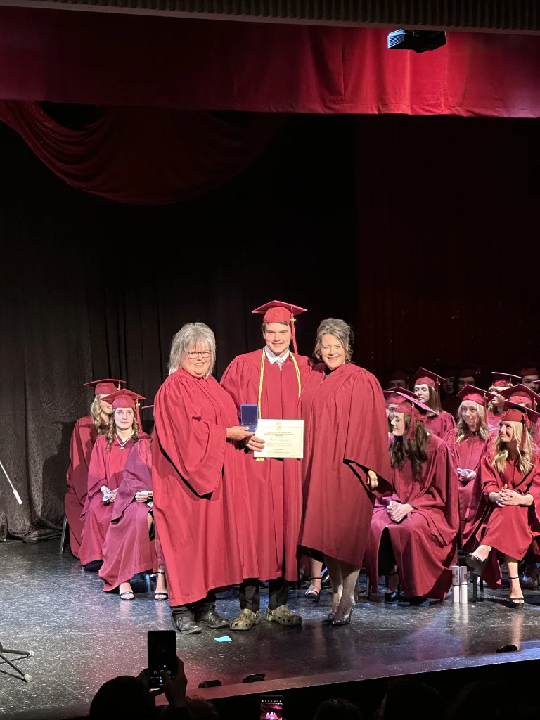 Antoine Lagarde (centre) receives Governor General’s Medal for the highest average as a member of the 2023-2024 ESSC graduating class, presented by principal Julie Martin (left) and vice-principal Gabie Paré (right). The recognition also earned him the position of class valedictorian. Photo: Sarah Pledge Dickson