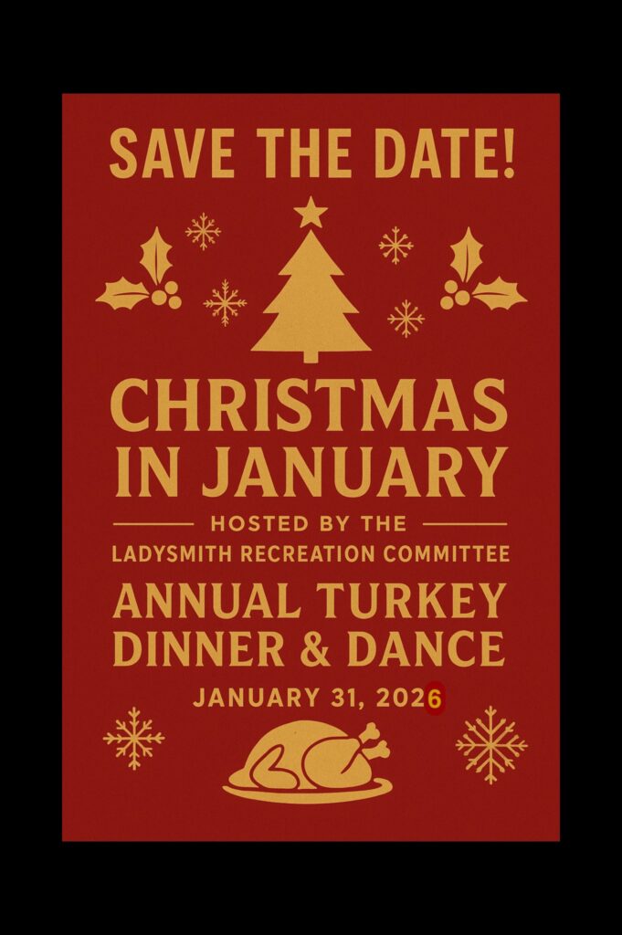 The Ladysmith Recreation Committee is hosting their Annual Turkey Dinner & Dance on Sat, Jan 31st. Contact committee members to grab your tickets, dinner starts at 5 p.m.