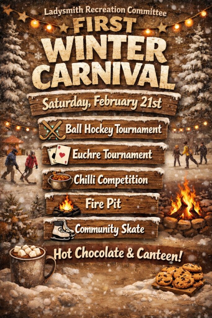The Ladysmith Recreation Committee is hosting its first Winter Carnival on Saturday, February 21st, featuring a full day of activities for all ages. The event includes a ball hockey tournament for $250 per team, a euchre tournament for $5 per person, and a chili competition. Guests can also enjoy a community skate, a fire pit, and refreshments from the canteen and hot chocolate station. To register a team or for more details, please message the committee directly.