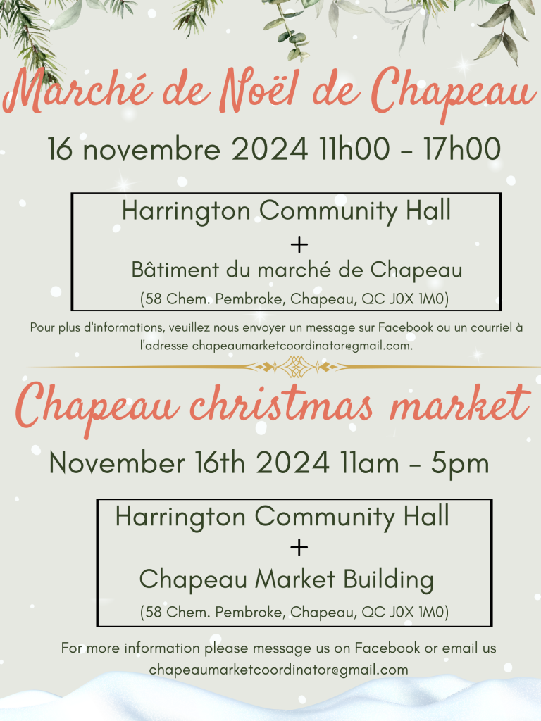 Join us on November 16th, from 11 AM to 5 PM, at the Harrington Community Hall and Chapeau Market Building!