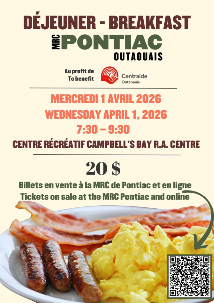 The MRC Pontiac invites you to a breakfast in support of Centraide Outaouais, which invests over $220,000 annually in community organizations across the Pontiac. Tickets are $20, and can be purchased at the MRC or online: https://shorturl.at/yBXYX .