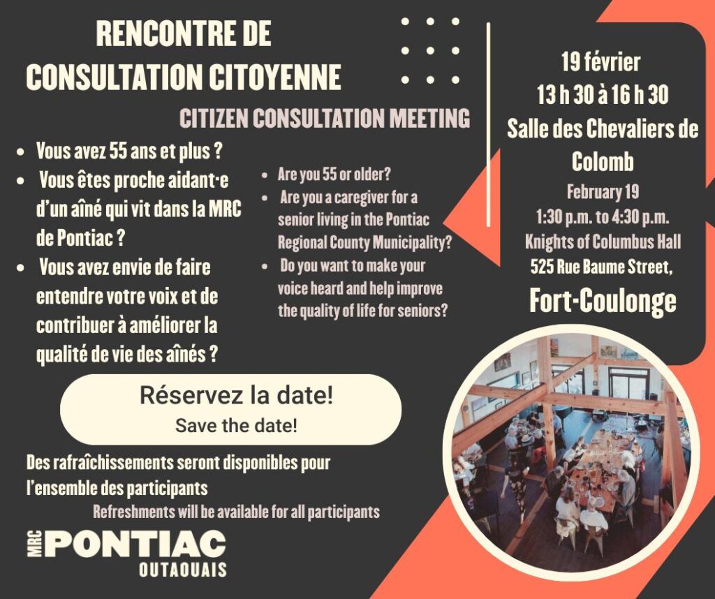 Come share your ideas and help us update our Age-Friendly Municipalities (MADA) policies in the Pontiac! February 19, 1:30 p.m. to 4:30 p.m., at the Knights of Columbus Hall – Council 7221 in the Municipality of Fort-Coulonge!