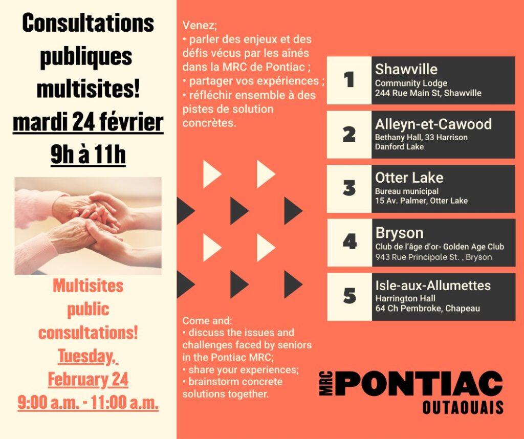 Can’t make it to the MRC’s seniors policy consultation on Feb. 19 in Fort-Coulonge? No worries! There are five more happening the morning of Feb. 24 at Shawville’s Community Lodge (244 rue Main), Bethany Hall in Alleyn-et-Cawood (33 rue Harrison), Otter Lake’s town hall (15 ave. Palmer), Bryson’s Golden Age Club (943 rue Principale), and the Harrington Hall in Chapeau (64 chem. Pembroke).