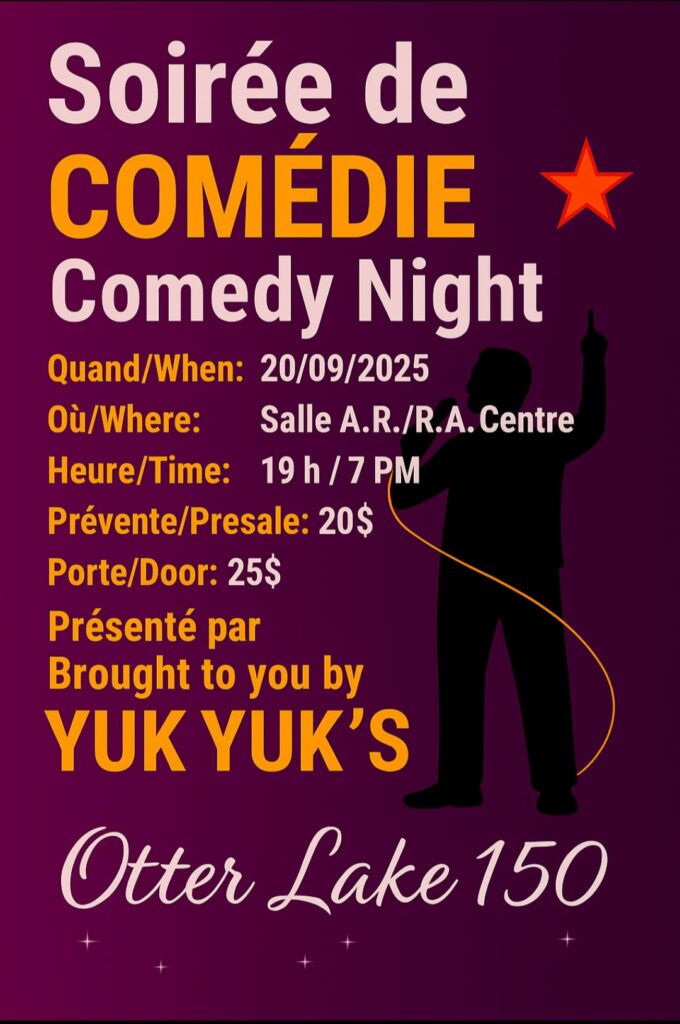 Le comité du 150e d’Otter Lake s’associe à Yuk Yuks, présent dans la région d’Ottawa et de la vallée depuis plus de 40 ans, pour vous offrir une soirée remplie de sourires et de fous rires!