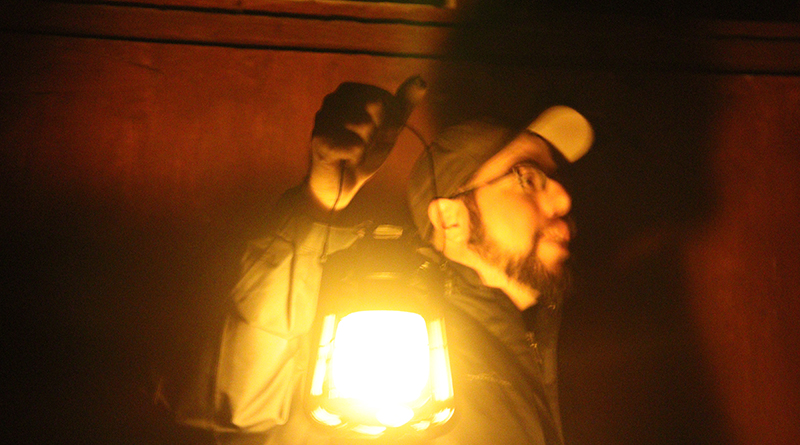 Brandon Bolduc owner of Aventure Outaouais holds the lantern and walks the group into a building at Starborn Farms to continue one of the ghost stories.