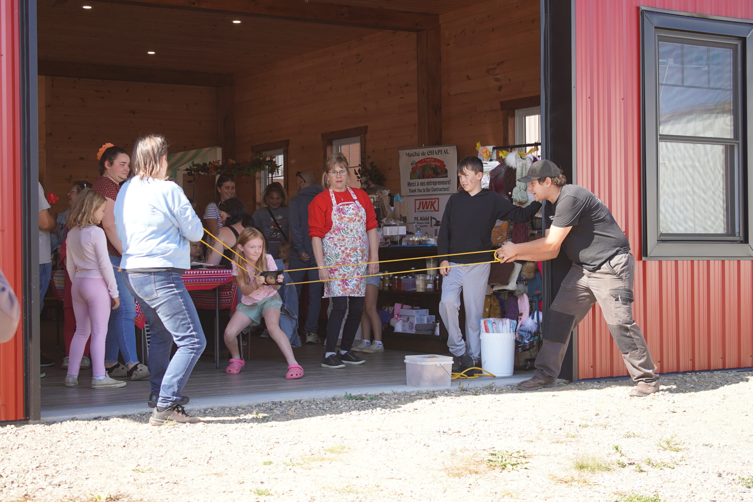 Ava Roberts takes aim with her potato during the fall fun fair at the Chapeau market on Saturday.