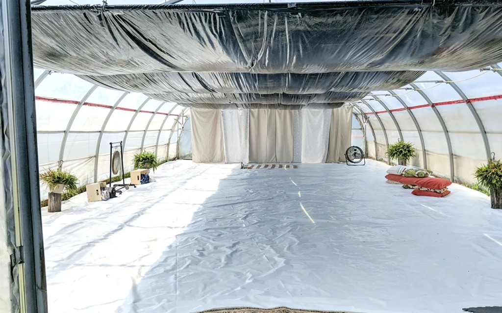 One of the greenhouses at the farm was transformed into a space where meditation and sound experience sessions were held throughout the day. Photo: Glen Hartle