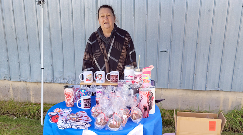 Debbie Dubé of Dz Creations at her table with assorted products including mugs, socks and her best seller, hot chocolate bombs.