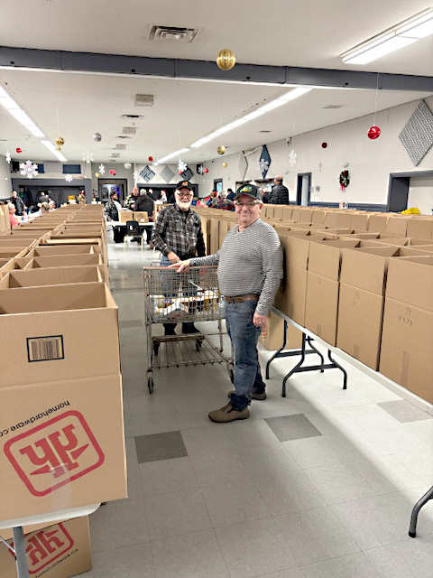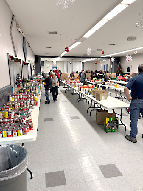 One of the organizers Ken Hobbs said that they send numerous teams of volunteers into the community (some singing carols) to collect donations on Friday, which are then sorted and distributed at the hall. He estimated that the tradition has been going on since the late 1970s, and while it was started by the local Knights of Columbus, anyone is welcome to lend a hand.