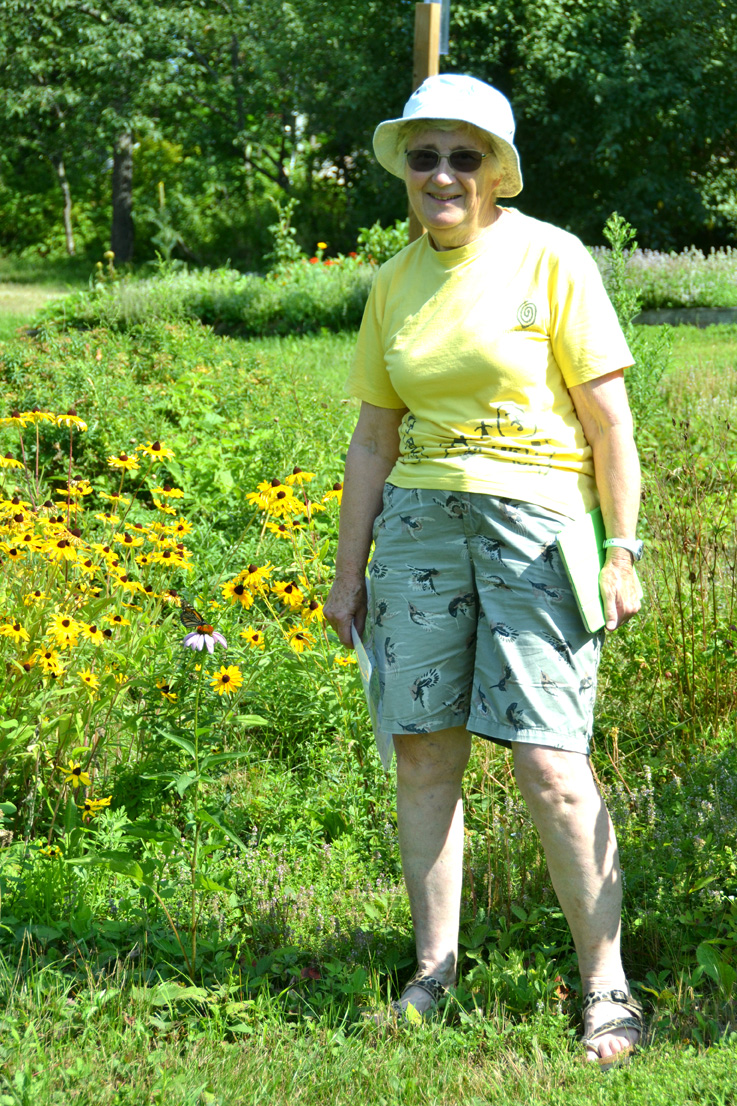 Mo Laidlaw had the southernmost garden on the tour, just outside of Aylmer in Breckenridge. In addtition to the knitted socks and crafts for sale in her garage, she had a walking path through her property, where she has been living for nine years. She pointed to the wide variety of native trees, like the Kentucky Coffeetree.