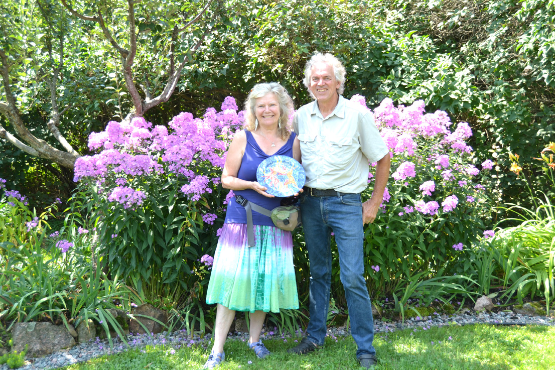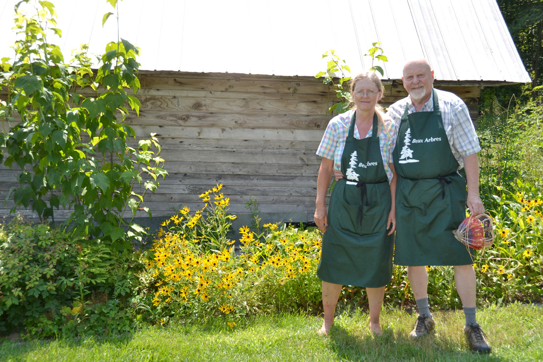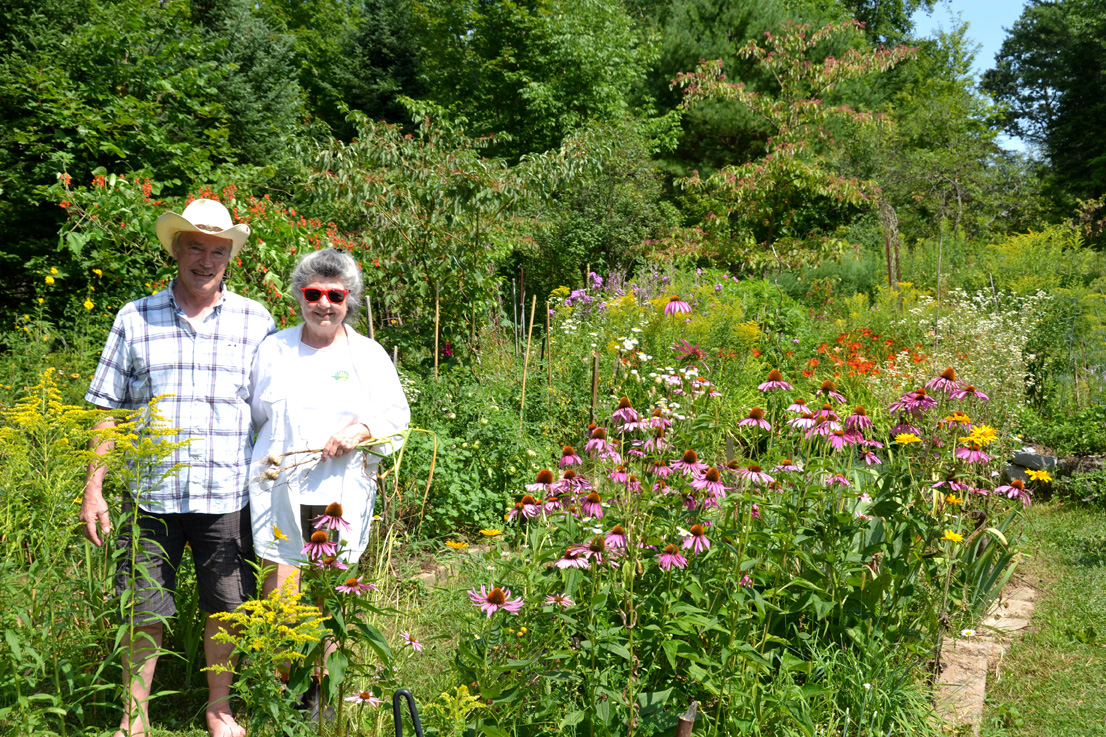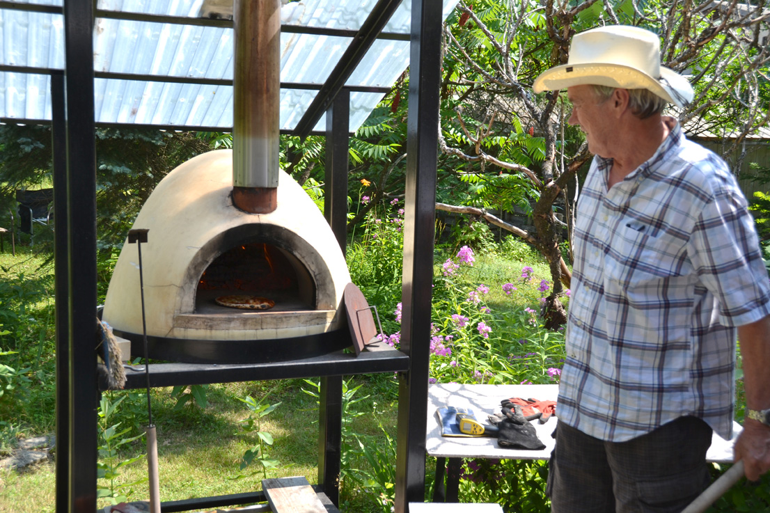 Over on chemin Brouse, Norbert and Leila Senf had their forest garden. Leila explained that due to the lack of light and hungry critters in the woods, her choice of plants is limited, though garlic seems to be doing well. Norbert, a mason by trade, operates a stone oven and masonry heater business (heatkit.com).